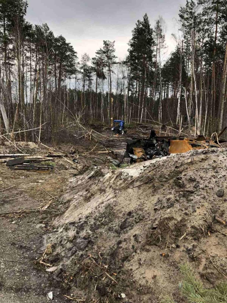 Усюди розстріляна техніка: поліцейські машини, два «Дастери», БМП, цивільний бус. Неподалік ворожий БМП із буквою «V», теж розстріляний. Углиб у ліс — розбита техніка росіян.